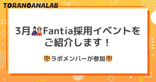こんにちは、虎の穴ラボ 採用担当 白石です。4月に向けて新生活を迎える準備をされている方も多いこの季節 今回は3月に予定されている採用イベントについて紹介いたします! ①3/18(火)19:00~ オンライン開催 Fantiaオンライン採用説明会&相談会 対象ポジショ…