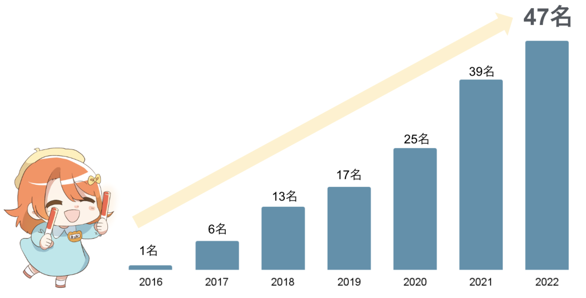 虎の穴ラボのメンバー数は、ここ3年間で3倍近い人数に増えています(2019年17名→2022年47名)