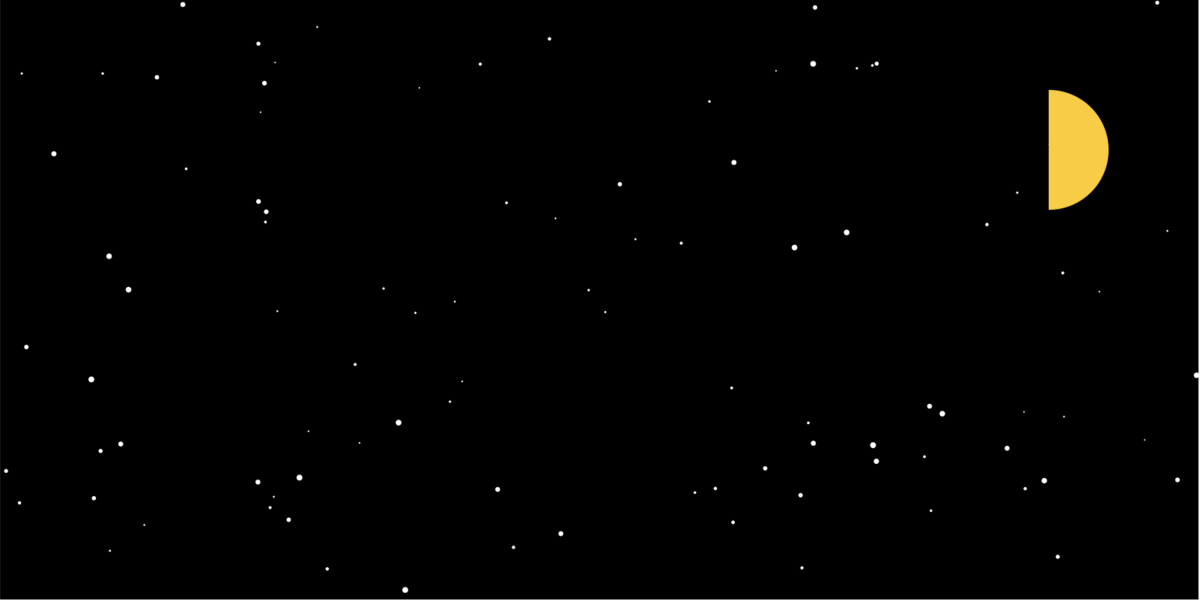 function setup() { createCanvas(800, 400); // 画面のサイズを指定 background(0); // 背景色を黒に指定 noLoop(); // draw()関数を自動的に繰り返し実行しないように設定 } function draw() { drawStars(); // 星を描画 drawMoon(width - 100, 100, 80); // 半月を描画 } function drawStars() { for (let i = 0; i < 100; i++) { let x = random(width); // x座標をランダムに決定 let y = random(height); // y座標をランダムに決定 let size = random(1, 4); // 星の大きさをランダムに決定 noStroke(); // 線を描画しないように設定 fill(255); // 白色で塗りつぶす ellipse(x, y, size, size); // 星を描画 } } function drawMoon(x, y, size) { noStroke(); // 線を描画しないように設定 fill(255); // 白色で塗りつぶす ellipse(x, y, size, size); // 円(半月の土台)を描画 fill(0); // 黒色で塗りつぶす arc(x, y, size, size, PI, TWO_PI); // 円弧(半月のくぼみ)を描画 }