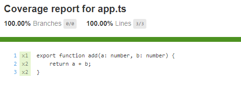 $ cat app.ts export function add(a: number, b: number) { return a + b; } $ cat app_test.ts import {expect} from "https://deno.land/std@0.212.0/expect/mod.ts"; import {add} from "./app.ts"; Deno.test("#add", () => { const x = add(1, 2); expect(x).toEqual(3); }) $ deno test --coverage running 1 test from ./app_test.ts #add ... ok (1ms) ok | 1 passed | 0 failed (24ms) # ./coverageにファイルが書き出される # 指定しない場合、summary レポーターで出力される $ deno coverage ----------------------------- File | Branch % | Line % | ----------------------------- app.ts | 100.0 | 100.0 | ----------------------------- All files | 100.0 | 100.0 | # 更新前のデフォルトレポーターは、detailed レポーターを設定すると使用可能 $ deno coverage --detailed cover file:///D:/development/test/deno-diff/1_39/app.ts ... 100.000% (3/3) # html レポーターで出力すると、ファイルが書き出される $ deno coverage --html HTML coverage report has been generated at file:///hogehoge/coverage/html/index.html