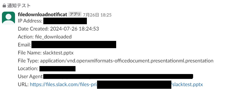 以下のように定期的にファイルダウンロードイベントをSlackチャンネルへ通知できました。